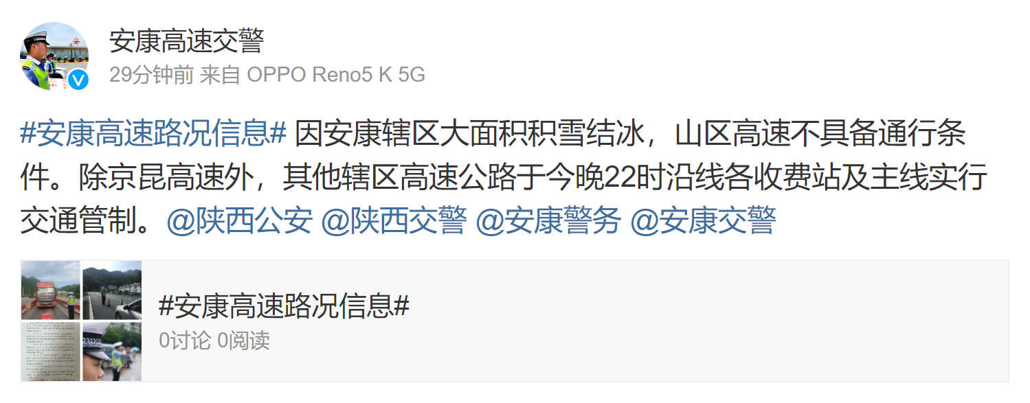 據(jù)安康高速交警消息:因安康轄區(qū)大面積積雪結(jié)冰,山區(qū)高速不具備通行條件。除京昆高速外,其他轄區(qū)高速公路于今晚(2月22日)10時(shí)沿線(xiàn)各收費(fèi)站及主線(xiàn)實(shí)行交通管制。?