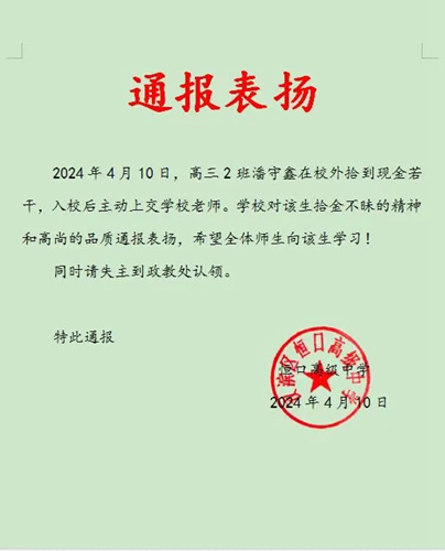 2024年4月10日早晨,高三2班潘守鑫同學(xué)在校門口拾到人民幣若干,在原地等了一會(huì)沒有失主來找,他毫不猶豫地走進(jìn)校園把錢交給政教處劉顯平老師。潘守鑫同學(xué)的行為展現(xiàn)了恒中學(xué)子良好的社會(huì)公德和個(gè)人素養(yǎng),為同學(xué)們樹立了一個(gè)好榜樣!