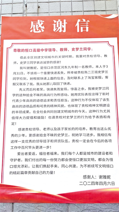 小城大愛,溫暖無處不在。近日,在恒口高級(jí)中學(xué),河?xùn)|九年制學(xué)校教師謝雅妮給該校學(xué)生史夢(mèng)蘭送來了一封暖意融融的感謝信,向她拾金不昧的行為表示感謝,也為學(xué)校的德育工作點(diǎn)贊。